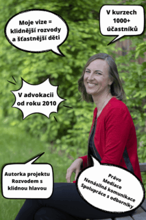 "Kurz bych určitě doporučila. Mě samotnou to přimělo nebýt tak urputná, neústupná a uzavřená. I když to dopadlo tak, že rozvod vidím jako nejlepší řešení, tak díky tomuto kurzu jsem si uvědomila, že dohody lze docílit. Jen se nebát si o tom postupně promluvit s protistranou, klidně i na etapy, a snažit se pochopit obranný postoj a prvotní nespolupráci protistrany. V mém případě se potýkám u partnera s diagnostikovanou a léčenou psychickou poruchou, ale i s ním jsme byli schopni nalézt po pár nezdarech a nedorozumění společnou řeč a shodli jsme se na tom, že oba chceme, aby naším rozvodem synek strádal co nejméně, a to jen díky tomu, co jsem slyšela u Vás v kurzu. Tak doufám, že to dotáhneme do zdárného a klidného konce. Děkuji za možnost účastnit se Vašeho kurzu."